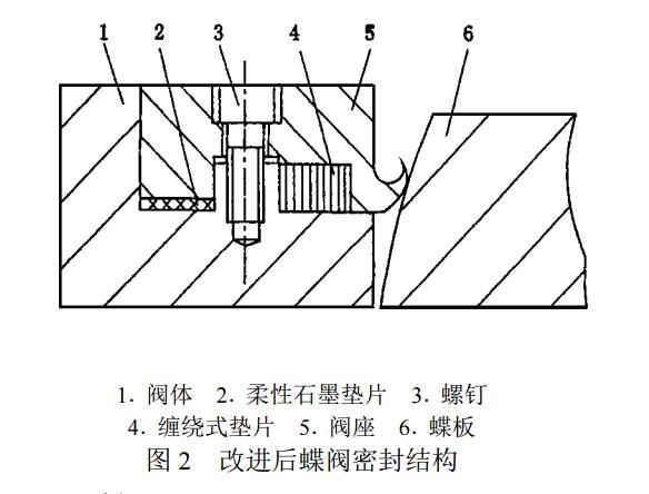 經長時間的觀察分析,確認該閥的密封結構設計不合理。當蝶閥工作時其調整墊片(材質為復合四氟)和密封圈(外保護層為1mm厚的金屬,內襯由四氟石墨和金屬絲編織而成)中的四氟材料隨介質壓力和溫度的升高而流失,使調整墊片和密封圈失去密封作用。另外,經分析和計算,當介質壓力直接作用于墊片時,墊片的截面寬度小于墊片所應具有的 小寬度,不能滿足密封要求,亦是造成高溫蝶閥介質外漏的原因之一。